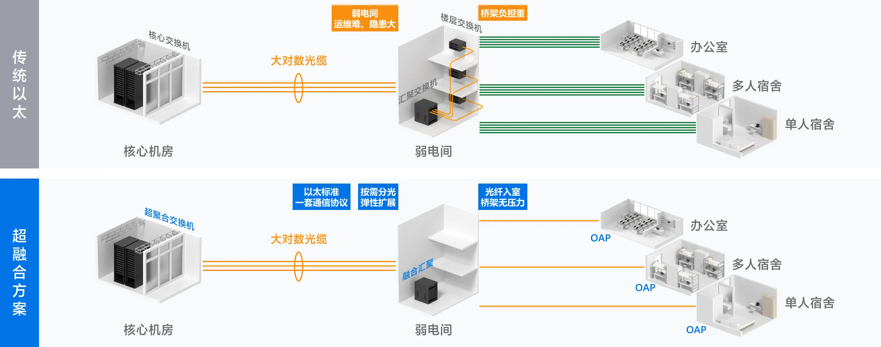 97¹ú¼Ê¼«¼òÒÔÌ«²Ê¹â4.0-³¬ÈںϽâ¾ö¼Æ»®£¬ÔÚʩչÒÔÌ«Íø¼Ü¹¹ÓÅÊÆ»ù´¡ÉÏ£¬ÒýÈëʱ·Ö¸´ÓÃÊÖÒÕ£¬ÌáÉýËÞÉáµÈ¸ßÃܶȳ¡¾°ÍøÂç×ÊԴʹÓÃÂÊ¡£¼Æ»®Í¨¹ý³¬ÈÚºÏÄ£¿éÓëÈںϻã¾Û£¬¹¹½¨´ó¶þ²ãÎÞÔ´×éÍø¼Ü¹¹£¬½¹µã×°±¸ÊµÏÖ¼¯Ô¼°²ÅÅ£¬µ¥Ì¨×°±¸¼´¿ÉÁýÕÖÕû¸öËÞÉáÔ°Çø¡£ÍŽáÁ¢ÒìÍÆ³öµÄ½ÓÈë²à³¬ÈÚºÏOAP£¬ÊµÏÖËÞÉáÍøÂçÎÞаÀ©ÈÝÓëÎȹÌÁýÕÖ¡£ÈÚºÏÒÔÌ«²Ê¹â¼Æ»®£¬Îª²î±ð´ø¿íÐèÇóµÄÔ°ÇøÓû§Ìṩ¶àÑù»¯Ñ¡Ôñ¡£